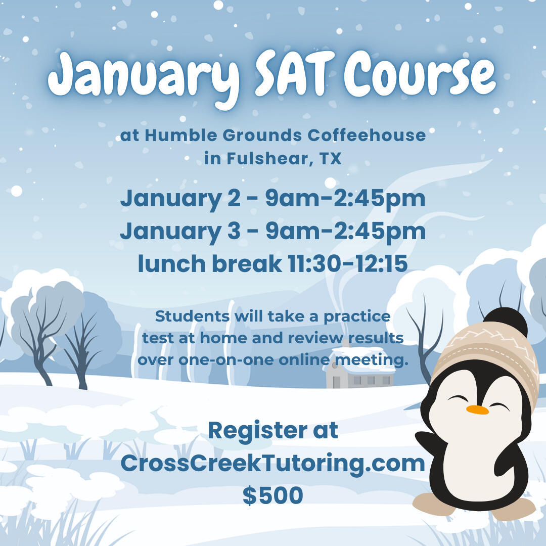 My mission is to serve students and their families by providing expert test prep close to home without requiring pricey packages.I provide small group and one-on-one SAT sessions, offering flexible scheduling to accommodate busy schedules.Currently all group classes have a maximum of 8 students and are hosted in the Humble Grounds Coffeehouse meeting room.